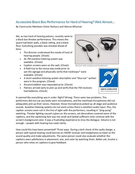 (November 2025) We, as two hard of hearing patrons, recently went to a black box theater performance. Everything possible was checked ahead of time.