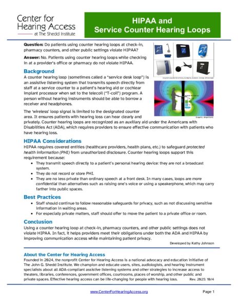 (1 page) Using a counter hearing loop at check-in, pharmacy counters, and other public settings does not violate HIPAA. In fact, it helps providers meet their obligations under both the ADA and HIPAA by improving communication access while maintaining patient privacy.